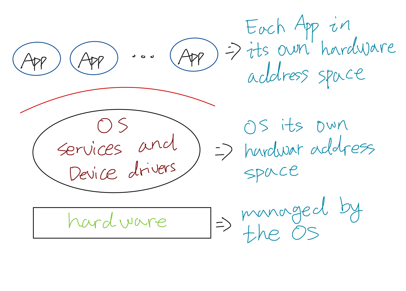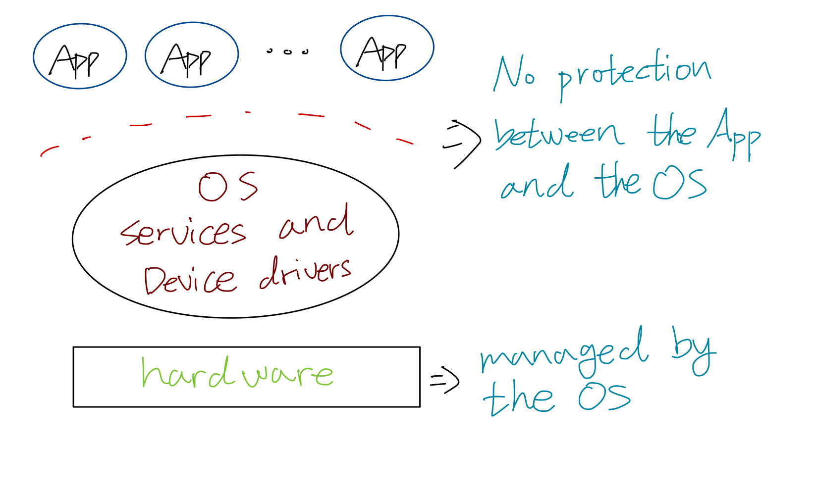가장 단순한 구조이다. 하드웨어는 OS로부터 관리되고, 애플리케이션들, OS 모두 각자의 하드웨어 주소 공간을 가지고 있다. 각자의 주소 공간을 가지고 있다는 의미는 애플리케이션과 OS는 서로 보호되고 있다. 이것을 Protection Domain이라고 부른다. 그래서 대부분의 애플리케이션에서 OS Service(File System, Scheduling, Memory Allocation)를 사용하기 위해서는 System Call 같은 API를 통해서 애플리케이션의 Protection Domain에서 OS Protection 도메인으로 이동해야 한다.