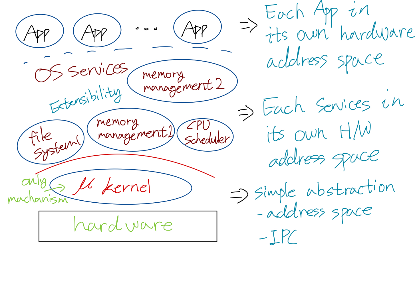 위에서 설명한 구조를 설계하면 u-kernel과 같은 구조로 만들 수 있다. u-kernel은 확장성을 위한 구조이다. 위의 그림은 u-kernel 구조이다. 필수적인 메커니즘은 u-kernel이라는 커널 영역에 두고, 정책에 해당하는 Service들은 커널 위에 두었다. Memory Management Service 가 2가지로 나눠져서 사용자가 어떤 정책을 사용할지 선택할 수 있다.