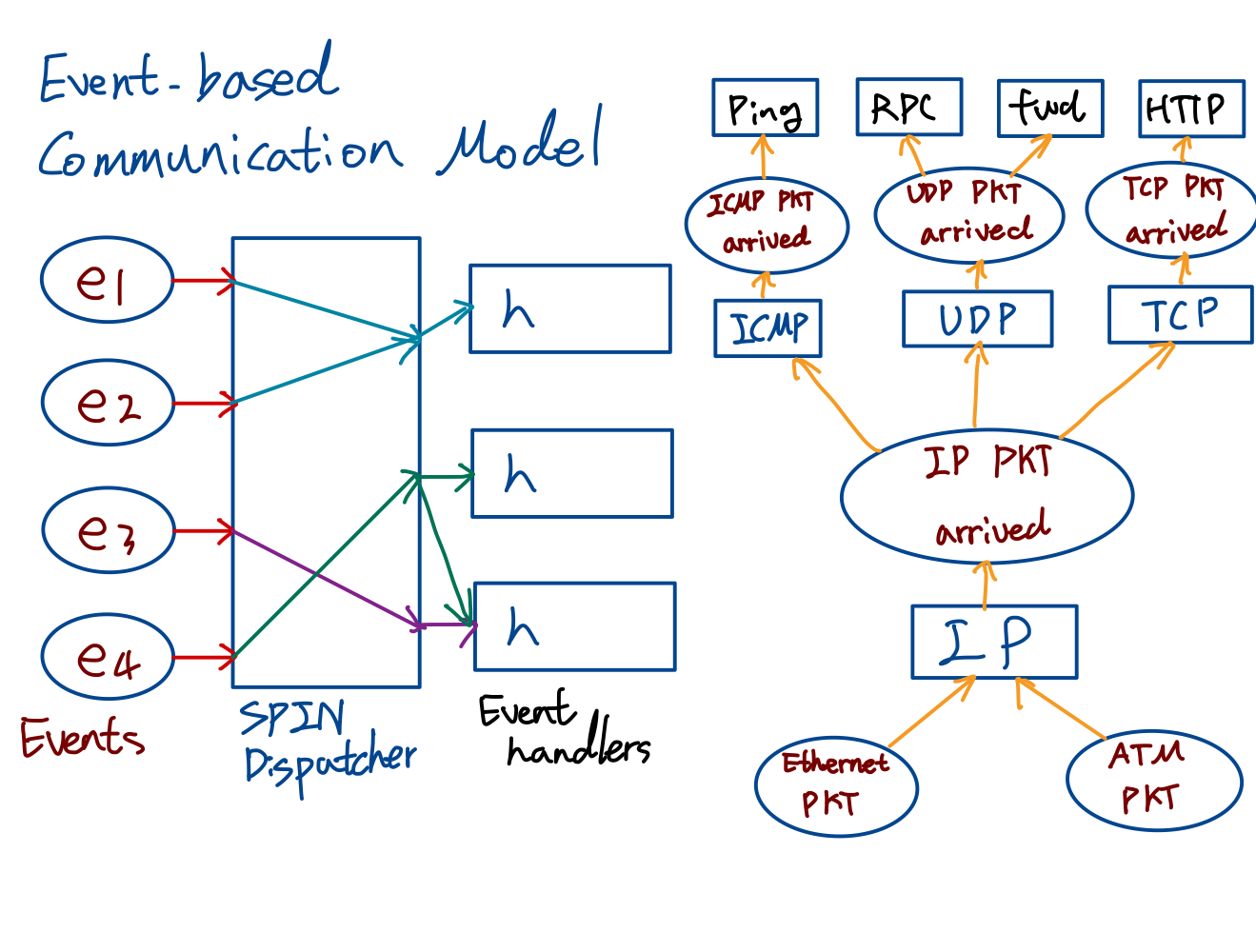 SPIN은 이벤트 기반의 메커니즘을 가지고 있다. 각 이벤트 핸들러는 OS Service들이 등록할 수 있고, 외부 이벤트와 맵핑(1:N, N:1)되어있다. 위 그림의 오른쪽 그림을 보면 네트워크 패킷 이벤트 처리에 대한 플로우를 보여주고 있다. 동그라미는 이벤트, 사각형은 핸들러이다. L2, L3, L4 단계로 레이어 된 처리 과정을 볼 수 있다.