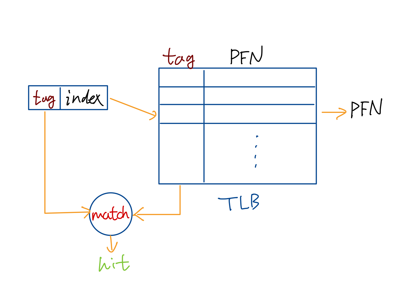 VPN는 tag와 index로 구성되어있다. 먼저 index를 가지고 TLB entry line을 찾는다. 그리고 tag와 TLB entry와 같으면 hit 시키고 PFN를 통해 메모리 접근을 하고, 아니면 Page fault를 일으킨다.